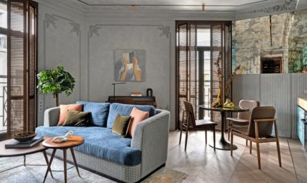 Отделка в квартире выполнена застройщиком, по дизайну всемирно известной компании Foster + Partners. Это текстильные панели на стенах, мраморные плинтусы, зеркальные потолки, бронзовые стеклянные дверцы и контрастная мозаика на полу в коридорах. А вот существующая мебель, на удивление, совсем не подходила помещениям ни по стилю, ни по размерам. Ровно такая же история касалась светильников — они были слишком малы для таких огромных пространств.