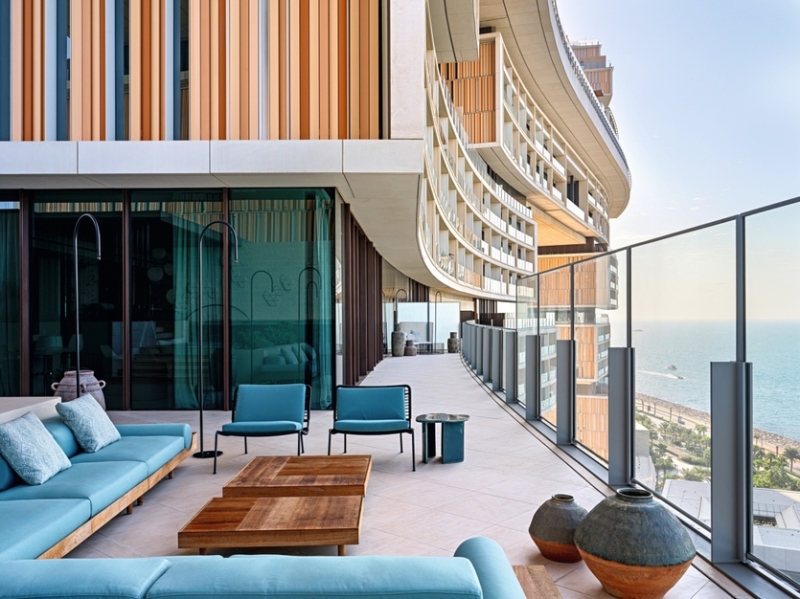 В этом проекте терраса стала смысловым центром, воплотив идею отдыха на стыке природы и изысканного дизайна. Диваны и кресла Living Divani из натурального тика текстиля цвета глубокого аквамарина — он перекликается с бирюзовыми водами Персидского залива.