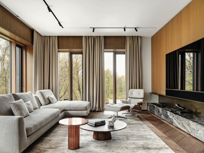 Центром интерьера, созданного студией ub.design для семьи с двумя детьми, стали панорамные виды на живописный парк за окном.
