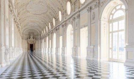 Вид на коридор особенно эффектен, когда аркада подчеркнута включенной закарнизной подсветкой. У коридора есть еще одна роль — картинной галереи. На стенах — штукатурка нейтрального тона, а для отделки пола в коридорах использовали керамогранит с эффектом натурального песчаника. Люстры, Heathfild.