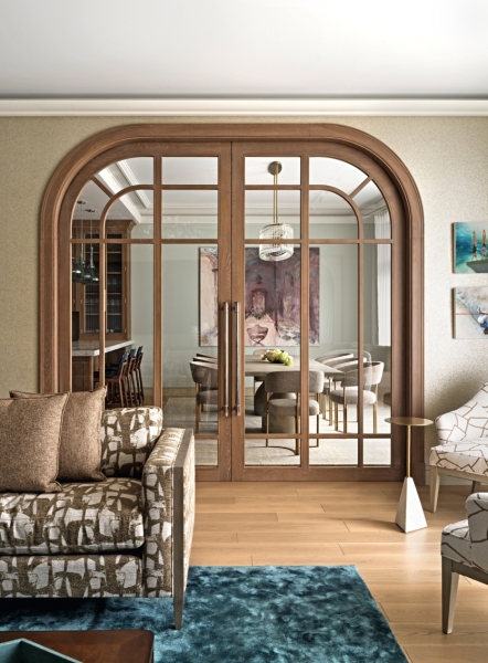 На стенах гостиной — покрытие с нанесением настоящей слюды. Нейтральное по цвету, оно деликатно переливается при изменении освещения и участвует в создании мягкой, камерной атмосферы. За арочной раздвижной перегородкой — кухня-столовая. Тема арки — центральная тема этого интерьера. Столярные изделия по эскизам бюро Olga Kushnareva-Leone Architecture&Design, поставщик Charles. Cameron. Диван, Vanguard Furniture. Столик, Century Furniture. Ковер, Loloey.