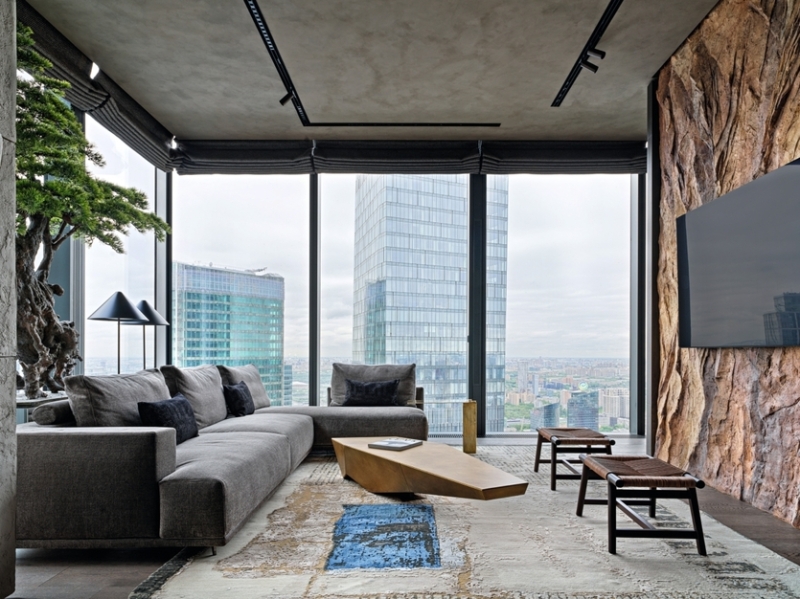 Преимущество просторной гостиной — панорамные окна в пол. За угловым диваном возвышается массивный бонсай. Колонна, как и центральная перегородка в виде стилизованной скалы, — это гипсовый барельеф, созданный скульптором Юлией Мекшун и покрытый каменной замшей, чтобы тактильно приблизиться к фактуре натурального камня.